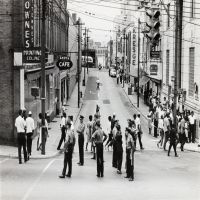 | Description | Black-and-white photograph down an uphill urban street with neon lights. White police watch a group of black women and men cross the street. |