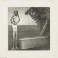 | Description | Grant Wood studied at the School of the Art Institute of Chicago between 1913 and 1916. Between 1937 and 1941, he created 19 lithographs that were published by Associated American Artist (A.A.A.), a private gallery and publisher. A.A.A had a unique approach to marketing, offering printed images of American life in large editions (usually 250 prints) at reasonable prices via mail order and through regional stores such as Marshall Field's in Chicago. This lithograph gained notoriety for its full-frontal portrayal of a nude man; the U.S. Post Office banned A.A.A. from mailing the print because it was considered obscene. As a result, only 100 impressions were made. [A work made of lithograph in black on ivory wove paper.] |