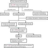 | Abstract | Background: Programmed cell death-1 (PD-1) displayed considerable advantages in neoadjuvant therapy of non-small cell lung cancer (NSCLC), but the specific application of neoadjuvant immunotherapy therapy has not been well determined, and the long-term prognostic data of neoadjuvant immunochemotherapy combined with surgical resection of NSCLC remains limited. In this study, we intended to assess the efficacy and long-term prognosis of the neoadjuvant use of the PD-1 inhibitor in patients with resectable NSCLC. Methods: We retrospectively analyzed NSCLC surgical patients treated with neoadjuvant therapy in our hospital, and divided them into a neoadjuvant chemotherapy group and a neoadjuvant immunotherapy combined chemotherapy group. The propensity score matching method was used to evaluate the effectiveness of immunotherapy combined with chemotherapy in the treatment of resectable lung cancer, and the long-term prognosis of these two groups was compared. Results: A total of 62 cases were enrolled, including 20 patients (20/62, 32.26%) in the immunotherapy group and 42 patients (42/62, 67.74%) in the chemotherapy group. The clinical baseline data of these two groups were balanced. In the immunotherapy group, all patients had tumor regression (tumor regression ratio: 11.88% - 75.00%). In the chemotherapy group, 30 patients had tumor regression (tumor regression ratio: 2.70% - 58.97%). The R0 removal rates of cancers were comparable between the immunotherapy group and the chemotherapy group (19/20, 95.00% vs. 35/38, 92.11%, P=1.000). The two groups were balanced in complete minimally invasive surgery, pneumonectomy, operative duration, blood loss, postoperative complications, and hospital stay. The immunotherapy group had a higher pathological complete response (pCR) rate (57.89% vs. 5.71%, P<0.001) and major pathologic response (MPR) rate (78.95% vs. 11.43%, P<0.001). There were no differences in survival curves for: male and female, smoker and non-smoker, squamous cell carcinoma and adenocarcinoma, or right lung cancer and left lung cancer. Moreover, patients who achieved MPR (including pCR) had significantly better overall survival (OS) and disease-free survival (DFS). Patients in immunotherapy group had significantly better OS and longer DFS than those in chemotherapy group. Conclusions: In conclusion, neoadjuvant immunotherapy combined with chemotherapy can provide better OS and DFS and improving pCR and MPR rates by shrinking tumors. |