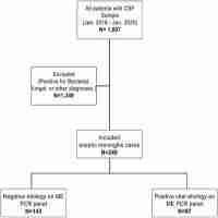 | Abstract | Background: CNS infection is associated with high rates of morbidity and mortality, and despite advancements in molecular testing, aseptic meningitis remains challenging to diagnose. Aseptic meningitis cases are often underreported worldwide, which impacts the quality of patient care. Therefore, we aimed to assess the results of BioFire® FilmArray® Meningitis/Encephalitis (ME) PCR Panel, clinical characteristics, and etiologies of aseptic meningitis patients. Methods: From January 2018 to January 2020, all pediatric and adult patients in a large tertiary medical center who underwent lumbar puncture, CSF testing by a ME multiplex PCR panel, and who fit the aseptic meningitis definition were retrospectively reviewed. Results: Data were reviewed from 1,607 patients; 240 met the inclusion criteria (54.6% males; 68.8% <4 years of age). The rate of detected viral causes of aseptic meningitis was 40.4%; therefore, 59.6% of the patients remained with unidentified etiology. Among the identified viral meningitis, enterovirus and HHV-6 were the most common (25% and 7.9%, respectively). The median length of hospital stay was six days, and it was longer in patients with unidentifiable aseptic meningitis (p ˂ 0.0001). Conclusion: Aseptic meningitis is common among suspected meningitis patients, although most cases remained of unknown etiology. The most common identified viruses were enterovirus followed by HHV-6; and predominance in males and the pediatric age group. These results highlight that further research is needed to identify other etiologies and possible additional viral pathogens for aseptic meningitis in the current diagnostic methods. |