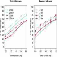 | Abstract | Anecdotal evidence suggests that unfamiliar languages sound faster than one’s native language. Empirical evidence for this impression has, so far, come from explicit rate judgments. The aim of the present study was to test whether such perceived rate differences between native and foreign languages have effects on implicit speech processing. Our measure of implicit rate perception was “normalization for speaking rate”: an ambiguous vowel between short /a/ and long /a:/ is interpreted as /a:/ following a fast but as /a/ following a slow carrier sentence. That is, listeners did not judge speech rate itself; instead, they categorized ambiguous vowels whose perception was implicitly affected by the rate of the context. We asked whether a bias towards long /a:/ might be observed when the context is not actually faster but simply spoken in a foreign language. A fully symmetrical experimental design was used: Dutch and German participants listened to rate matched (fast and slow) sentences in both languages spoken by the same bilingual speaker. Sentences were followed by nonwords that contained vowels from an /a-a:/ duration continuum. Results from Experiments 1 and 2 showed a consistent effect of rate normalization for both listener groups. Moreover, for German listeners, across the two experiments, foreign sentences triggered more /a:/ responses than (rate matched) native sentences, suggesting that foreign sentences were indeed perceived as faster. Moreover, this Foreign Language effect was modulated by participants’ ability to understand the foreign language: those participants that scored higher on a foreign language translation task showed less of a Foreign Language effect. However, opposite effects were found for the Dutch listeners. For them, their native rather than the foreign language induced more /a:/ responses. Nevertheless, this reversed effect could be reduced when additional spectral properties of the context were controlled for. Experiment 3, using explicit rate judgments, replicated the effect for German but not Dutch listeners. We therefore conclude that the subjective impression that foreign languages sound fast may have an effect on implicit speech processing, with implications for how language learners perceive spoken segments in a foreign language. |