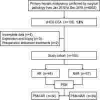 | Description | BackgroundThe efficacies of anatomical resection (AR) and non-anatomical resection (NAR) in the treatment of combined hepatocellular-cholangiocarcinoma (cHCC-CCA) remain unclear. This study aimed to compare the prognostic outcomes of AR with those of NAR for cHCC-CCA.MethodPatients diagnosed with pathology-confirmed cHCC-CCA, and who underwent curative resection at Tongji hospital between January 2010 and December 2019 were included in this retrospective study. A one-to-one propensity score matching (PSM) analysis was used to compare the long-term outcomes of AR to those of NAR.ResultsA total of 105 patients were analyzed, of whom 48 (45.7%) and 57 (54.3%) underwent AR and NAR, respectively. There were no significant differences in short-term outcomes between the two groups, including duration of postoperative hospital stay, the incidence of perioperative complications, and incidence of 30-day mortality. However, both, the 5-year overall survival (OS) and recurrence-free survival (RFS) rates of AR were significantly better than those of NAR (40.5% vs. 22.4%, P=0.002; and 37.3% vs. 14.4%, P=0.002, respectively). Multivariate analysis showed that NAR, multiple tumors, larger-sized tumors (>5 cm), cirrhosis, lymph node metastasis, and vascular invasion were independent risk factors for poor prognoses. Stratified analysis demonstrated similar outcomes following AR versus NAR for patients with tumors > 5cm in diameter, while AR had better survival than NAR in patients with tumo... |