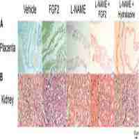| Abstract | Background: In preeclampsia, a hypertensive disorder of pregnancy, the poor remodeling of spiral arteries leads to placental hypoperfusion and ischemia, provoking generalized maternal endothelial dysfunction and, in severe cases, death. Endothelial and placental remodeling is important for correct pregnancy evolution and is mediated by cytokines and growth factors such as fibroblast growth factor type 2 (FGF2). In this study, we evaluated the effect of human recombinant FGF2 (rhFGF2) administration in a murine model of PE induced by NG-nitro-L-arginine methyl ester (L-NAME) to test if rhFGF2 administration can lessen the clinical manifestations of PE. Methods: Pregnant rats were administrated with 0.9% of NaCl (vehicle), L-NAME (60 mg/kg), FGF2 (666.6 ng/kg), L-NAME+FGF2 or L-NAME + hydralazine (10 mg/kg) from the 10th to 19th days of gestation. Blood pressure (BP), urine protein concentrations and anthropometric values both rat and fetuses were assessed. Histological evaluation of organs from rats delivered by cesarean section was carried out using hematoxylin and eosin staining. Results: A PE-like model was established, and it included phenotypes such as maternal hypertension, proteinuria, and fetal growth delay. Compared to the groups treated with L-NAME, the L-NAME + FGF2 group was similar to vehicle: the BP remained stable and the rats did not develop enhanced proteinuria. Both the fetuses and placentas from rats treated with L-NAME + FGF2 had similar values of weight and size compared with the vehicle. Conclusion: The intravenous administration of rhFGF2 showed beneficial and hypotensive effects, reducing the clinical manifestations of PE in the evaluated model. |